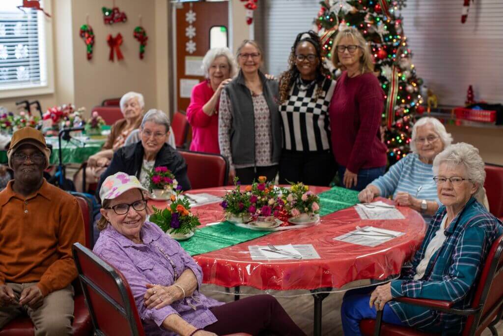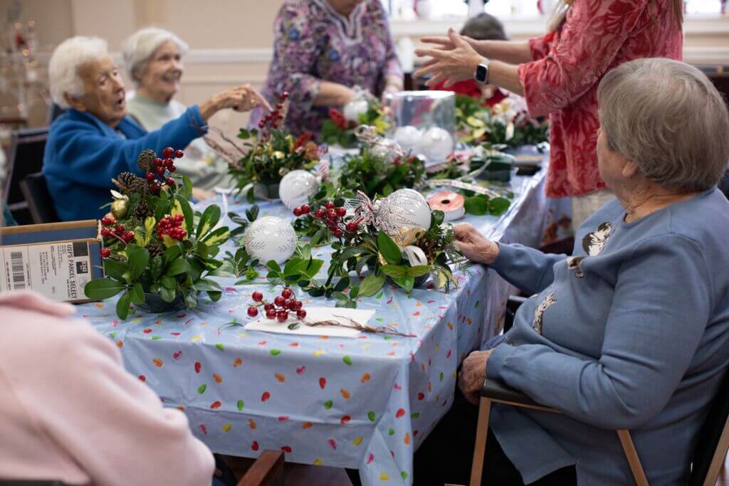 FERNANDINA BEACH, Fla. — For the past six years, The Bartram Garden Club has supported the Nassau County Council on Aging (NCCOA) by offering design workshops, floral arrangements for Meals on Wheels residents, and garden therapy sessions for NCCOA groups. Last week, several garden club members visited NCCOA’s Just Friends and The Club programs, bringing their familiar spirit of beauty and creativity. In Just Friends, participants created floral designs in vintage teacups, while in The Club they crafted winter-themed centerpieces featuring green foliage, pinecones, deep red cranberries, and glittered strips of gold ribbon.